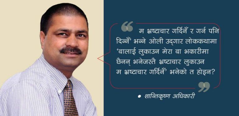 ‘म भ्रष्टाचार गर्दिनँ र गर्न पनि दिन्नँ’ भन्ने ओली उद्गार सबै सरकारी कार्यालयमा टाँसिएको छ। यो त लोककथामा ‘बालाई लुकाउन मेरा बा भकारीमा छैनन् भनेजस्तै भ्रष्टाचार लुकाउन म भ्रष्टाचार गर्दिनँ’ भनेको त होइन?