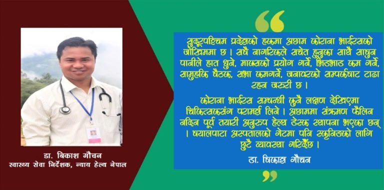 अछाम जिल्लाका साथै सुदूरपश्चिम र कर्णालीका केहि जिल्लाका बिरामीहरुलाई निशुल्क रुपमा स्वास्थ्य सेवा प्रवाह गरी सेवाग्राहीको मन जितेर नेपालमै उत्कृष्ट अस्पतालको नाम दर्ज गराउन बयालपाटा अस्पताल यसअघि नै सफल भईसकेको छ । गुणस्तरिय सेवा सबैका लागि हुनुपर्छ भन्ने ध्ययेका साथ अघि बढेको संस्था न्याय हेल्थ नेपालद्धारा संचालित अछाम स्थित बयालपाटा अस्पतालले हाल बिश्वभरमा त्रासको रुपमा फैलिरहेको कोराना भाईरस कोभिड १९ को संक्रमण फैलिन नदिनका लागि भने के गर्दै छ त ? कोराना भाईरस कोभिड १९ को बिषयमा केन्द्रित रहेर न्याय हेल्थ नेपाल बयालपाटा अस्पतालका स्वास्थ्य सेवा निर्देशक डाक्टर बिकाश गौचन संग यस सुदूर आजका प्रधान सम्पादक पूर्णबहादुर खड्काले गर्नुभएको कुराकानीको सम्पादित अंश ।