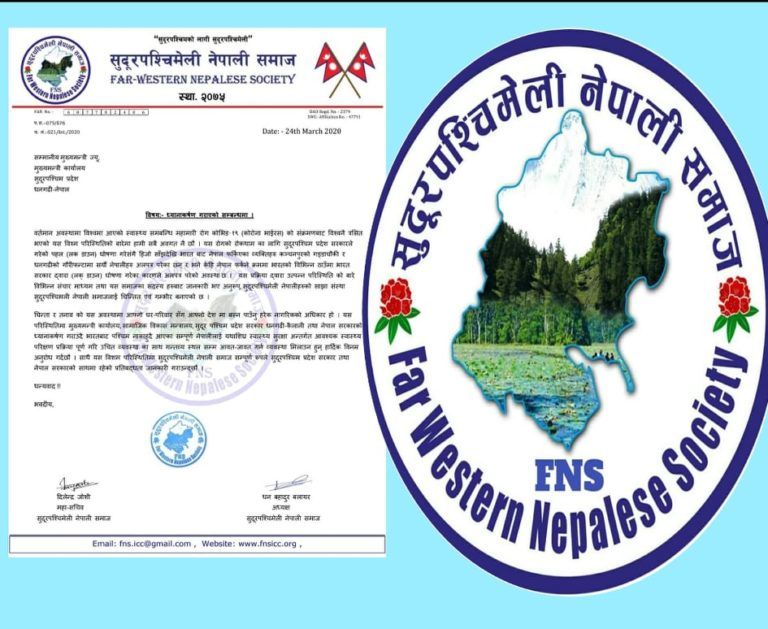 नेपाल फर्कने क्रममा भारतको विभिन्न ठाउँमा भारत सरकार द्वारा (लक् डाउन) घोषणा गरेका कारणले अलपत्र परेको अवस्थामा उत्पन्न परिस्थिति को बारे विभिन्न संचार माध्यमहरुबाट जानकारी भए अनुरूप, सुदूरपश्चिमेली नेपालीहरुको साझा संस्था सुदूरपश्चिमली नेपाली समाजलाई चिन्तित एवं गम्भीर बनाएको जारी पत्र उल्लेखमा छ ।