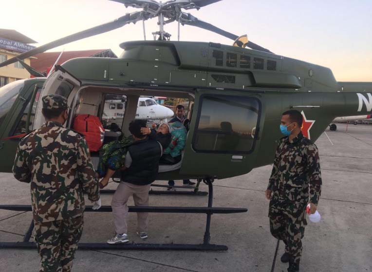 सुत्केरी हुन नसकेपछि एक गर्भवती महिलालाई सेनाको हेलिकप्टरबाट काठमाण्डौ ल्याइएको छ। सोलुको सोताङ गाँउपालिका ४ की ३० वर्षीय पुष्पकला राई स्थानीय प्राथमिक स्वास्थ्य केन्द्रमा सुत्केरी हुन नसकेपछि उनलाई महिला बालबालिका तथा जेष्ठ नागरिकमन्त्री पार्वत गुरुङको पहलमा काठमाडौं ल्याइएको हो।