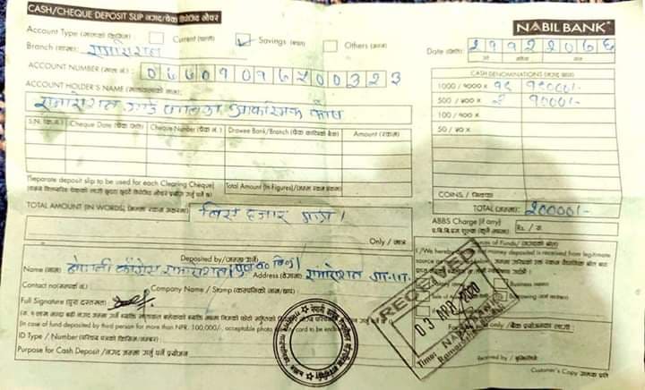 निमित्त प्रमुख प्रशासकीय अधिकृत राम बहादुर भण्डारी लाई पालिकाले सन्चालन गरेको आकस्मिक कोषको खातामा जम्मा गरेको रकमको भौचर प्रदान गरि सहयोग गरिएको हो ।
