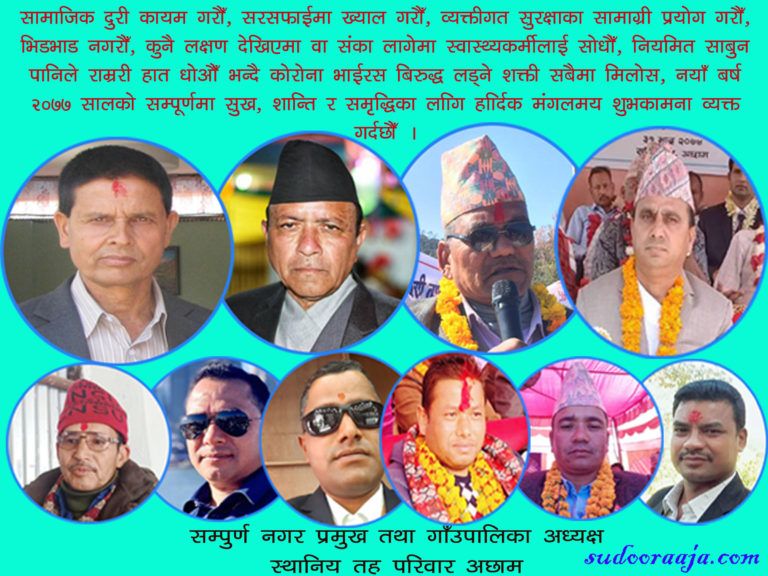 साँफेबगर नगरपालिकाका प्रमुख कुलबहादुर कुवँरले २०७६ सालको बिदाई संगै कोरोना भाईरसको लडाईमा बिजयी प्राप्त हुन सकोस भन्दै नयाँ बर्ष २०७७ सालको शुभकामना व्यक्त गर्नुभएको छ ।