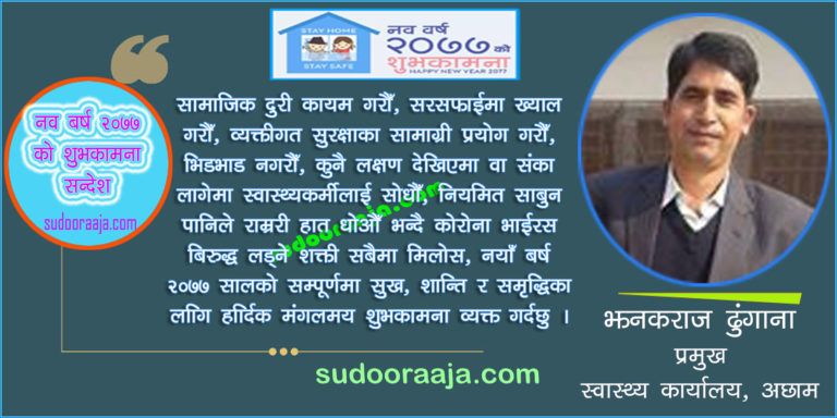 स्वास्थ्य कार्यालय अछामका प्रमुख झनकराज ढुंगानाले नयाँ बर्ष २०७७ को अवसरमा जिल्लाबासी तथा देशबासीमा सुस्वास्थ्य, दिर्घायू, सुख, शान्ति र समृद्धीको लागि शुभकामना व्यक्त गर्नुभएको छ ।