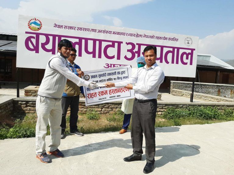 बयालपाटा अस्पताललाई बिभिन्न क्षेत्रबाट सहयोग आउनेक्रम जारी रहेको छ । आज नयाँ बर्ष २०७७ को अवसर पारी अछाम सुनचाँदी व्यावसायि संघ अछामले कोरोना भाईरस (कोभिड १९) बिरुद्ध लड्न सहयोग पुगोस भनेर आर्थिक सहयोग गरेको छ ।