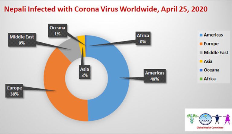 गैरआवासीय नेपाली संघ अन्तरर्गतको स्वास्थ्य समितिले संकलन गरेको तथ्यांक अनुसार बेलायतमा ३३, अमेरिकामा १०, युएईमा २, आयरल्याण्डमा १, जापानमा १, टर्कीमा १ र नेदरल्याण्डमा १ जना गरी ४९ नेपालीको ज्यान गएको हो ।