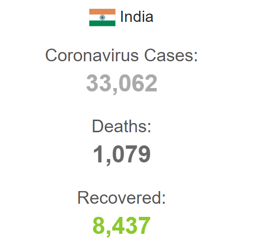 त्यस्तै भारतमा कोरोनाबाट संक्रमित हुनेको संख्या ३३ हजार ६२ पुगेको छ। कोरोनाबाट संक्रमित भएका ८ हजार ४ सय ३७ जना भने उपचारपछि निको भएका छन्।