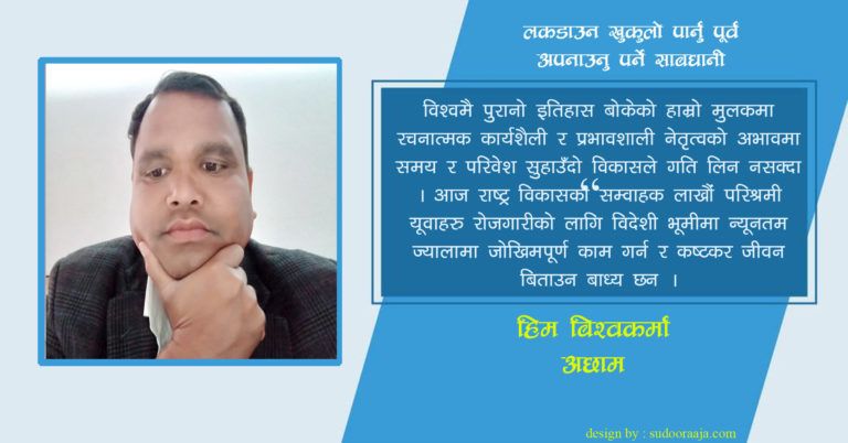 तर ! के गर्ने ? विश्वमै पुरानो इतिहास बोकेको हाम्रो मुलकमा रचनात्मक कार्यशैली र प्रभावशाली नेतृत्वको अभावमा समय र परिवेश सुहाउँदो विकासले गति लिन नसक्दा । आज राष्ट्र विकासका सम्वाहक लाखौं परिश्रमी यूवाहरु रोजगारीको लागि विदेशी भूमीमा न्यूनतम ज्यालामा जोखिमपूर्ण काम गर्न र कष्टकर जीवन बिताउन बाध्य छन ।