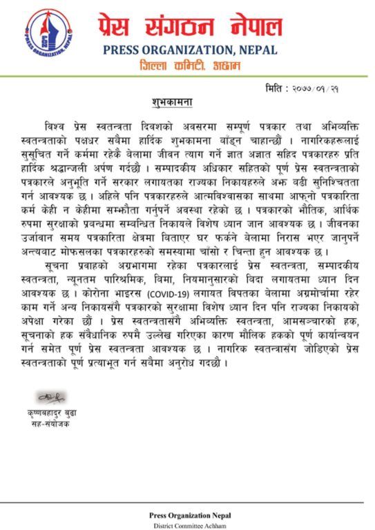 प्रेस संगठन नेपाल जिल्ला शाखा अछामले विश्व प्रेस स्वतन्त्रता दिवशको अवसरमा शुभकामना वक्तव्य जारी गर्दै सम्पूर्ण पत्रकार तथा अभिव्यक्ति स्वतन्त्रताको पक्षधर सबैमा शुभकामना व्यक्त गरेको छ ।
