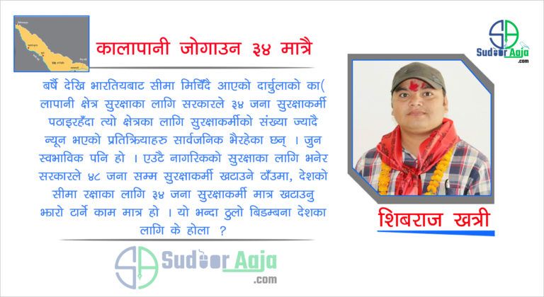 बर्षै देखि छिमेकी मुलुक भारतीबाट सीमा मिचिँदै आएको दार्चुलाको कालापानी क्षेत्रको सुरक्षाका लागि भनेर सरकारले ३४ जना सुरक्षाकर्मी पठाइरहँदा त्यो क्षेत्रका लागि सुरक्षाकर्मीको संख्या ज्यादै न्यून भएको प्रतिक्रियाहरु सार्वजनिक भैरहेका छन्। जुन स्वभाविक पनि हो । एउटै नागरिकको सुरक्षाकालागि भनेर सरकारले ४८ जना सम्म सुरक्षाकर्मी खटाउने तर, देशको सीमा रक्षाका लागि ३४ जना सुरक्षाकर्मी मात्र खटाउनु भनेको झारो टार्ने काम मात्र हो ।