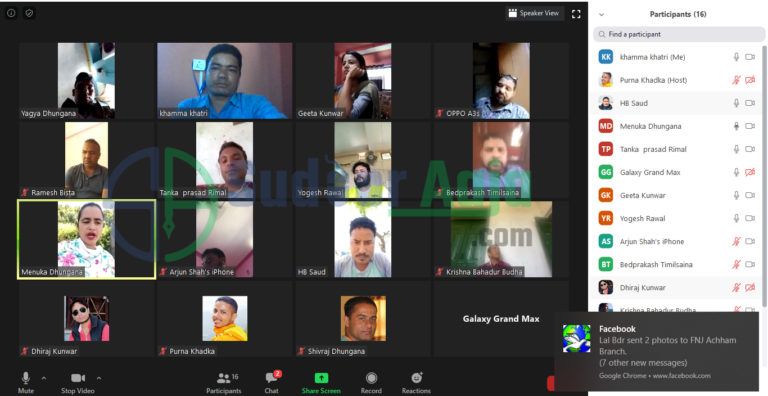 नेपाल पत्रकार महासंघ अछामले भिडियो कन्फ्रेन्स मार्फत बैठकको आयोजना गरेर जिल्लाका पत्रकारहरुको अवस्थाका बारेमा छलफल गरेको छ । अछाम शाखाले पत्रकार महासघ केन्द्रिय समिति र सुदुरपश्चीम प्रदेश समितिका पदाधिकारीसंग कोरोना भाईरसका कारण सञ्चारक्षेत्र र सचारकर्मीहरुले व्यहोर्नु परेको क्षतिको बिषयमा छलफल गरेको हो ।