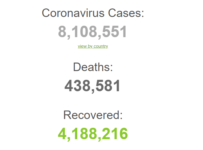 यस्तै ८१ लाख ८ हजार ५ सय ५५ जनामा कोरोना संक्रमण भएको छ, भने विश्वभर अहिलेसम्म ४१ लाख ८८ हजार २ सय १६ जना निको भइसकेका छन्।