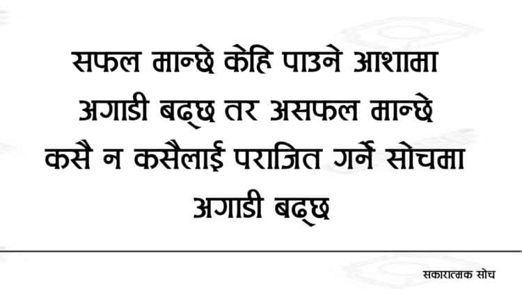 ८. एउटा सफल मान्छे सधै केहि न केहि पाउने आशमा अगाडी बढ्ने गर्छ तर एउटा असफल मान्छे सधै कसै न कसैलाई पराजित गर्ने सोचमा अगाडी बढ्छ, त्यसैले सहि मान्छे सफल हुदै जान्छ र गलत मान्छे पतन हुदै जान्छ ।