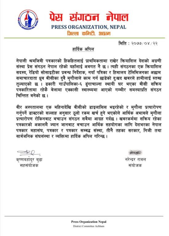 आर्थिक अभावले मृगौला प्रत्यारोपण रोकिनबाट बचाउन प्रेस संगठन अछामको आग्रह
