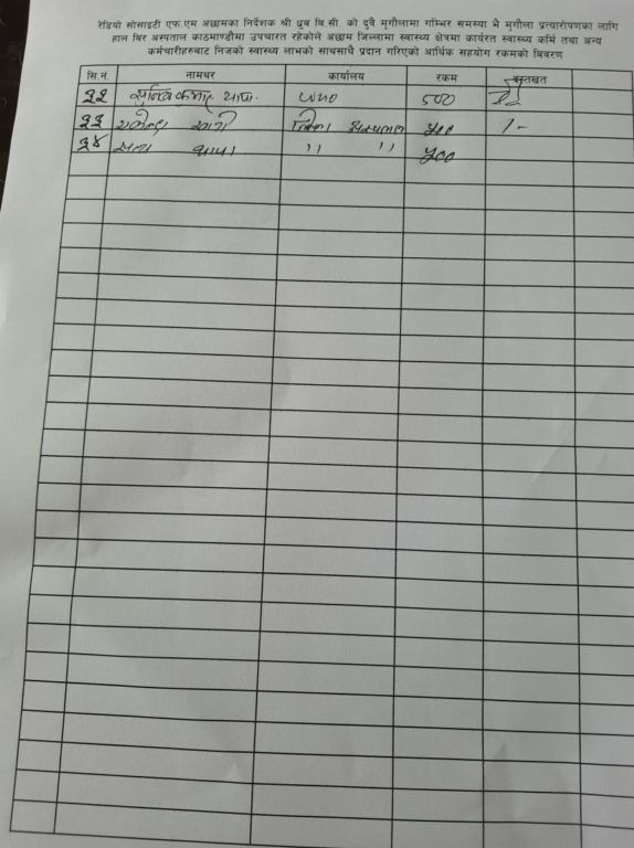 सँकलीत रकम संञ्चारकर्मि बिसिको खातामा आजै जम्मा गरिसकिएको र अन्य स्थानिय तहका स्वास्थ्य कर्मि तथा कर्मचारीसँग सहयोगका लागि आग्रह गर्ने कार्य जारी रहेको स्वास्थ्य कार्यालय अछामका प्रमुख झनकराज ढुगाँनाले बताए ।