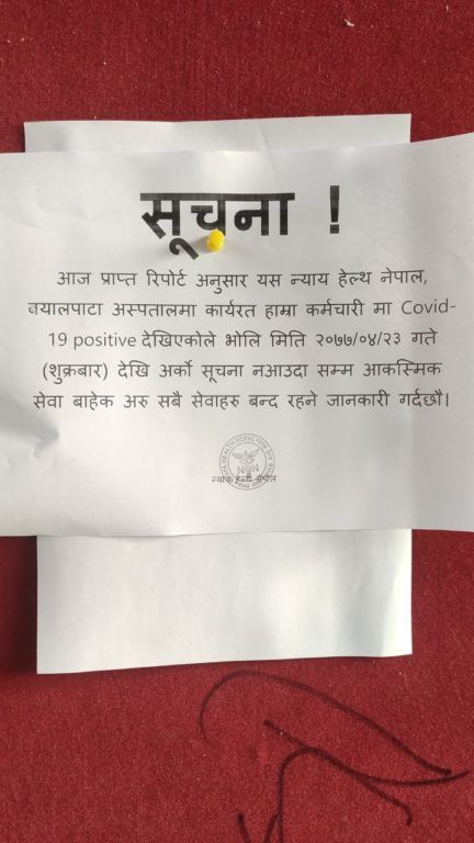 न्याय हेल्थ नेपालद्धारा संचालति बयालपाटा असपतालमा एक जना स्वास्थ्यकर्मीलाई कोरोना भार्यरसको संक्रमण देखिएको छ ।