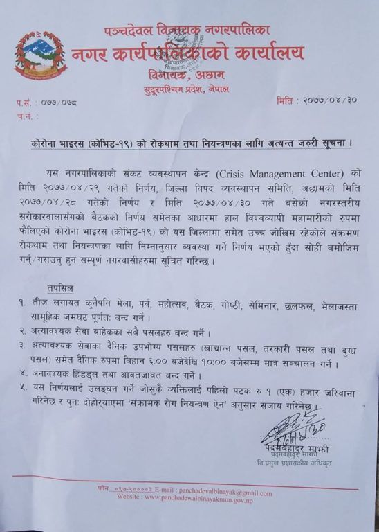 जिल्ला विपद ब्यावस्थापन समिती अछामले श्रावण २८ गते गरेको निर्णय अनुसार पञ्चदेवल विनायक नगरपालिकाको संकट व्यावस्थापन केन्द्रले तिज लगायत कुनै पनि मेला पर्व, महोत्सव,गोष्टी,सेमिनार,छलफल,भेला जस्ता सामुहिक जमघट पुर्ण रुपमा बन्द गर्ने निर्णय गरे संगै शुक्रबार कोभिड–१९ संक्रमण रोकथाम तथा नियन्त्रणका लागी सरोकारवालासंग अन्तरक्रियात्मक बैठक नगरपालिकामा सम्पन भएको छ ।