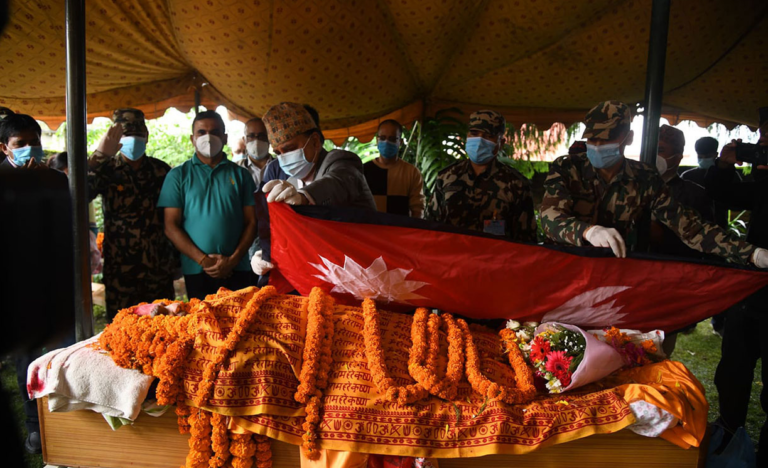 आज विहान घिमिरेकै निवासमा पुगेर पोखरेलले राष्ट्रिय झण्डा ओढाएका हुन् ।