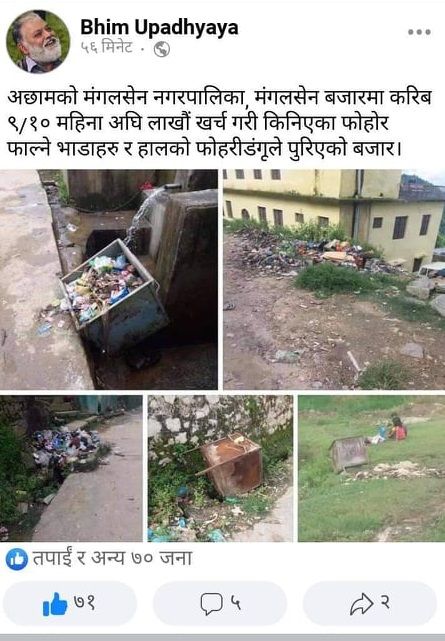 नेपाल सरकारका पुर्व सचिव समेत उपाध्यायले समेत मंगलसेन बजारमा देखिएको अव्यवस्थित फोहोरको बारेमा सामाजिक संजालमा कुरा उठाएका छन् । उनले लेखेका छन् करिब १० महिना अघि लाखौँ खर्च गरेर फोहोर फाल्ने भाडा किनिएकोमा हाल फोहोरको थुप्रोले भरिएर अव्यवस्थित देखिएका छन् ।