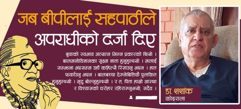 तर, बीपीको स्वभाव अत्यत्न भिन्न प्रकारको थियो । बालमनोविज्ञानका सूक्ष्म अध्येता हुनुहुन्थ्यो । मलाई सम्झना भएसम्म उहाँले कहिल्यै झर्कोफर्को गर्नुभएन । बालबच्चलाई हात फर्काउनु भएन । कटु बोल्नुभएन । केटाकेटी देख्नेबित्तिकै पुलकित हुनुहुन्थ्यो । पिता हाम्रो आस्था र विश्वासको खाँबो रहिरनुभयो । र, हामी श्रद्धाले निहुरिरह्यौं, सदैव ।