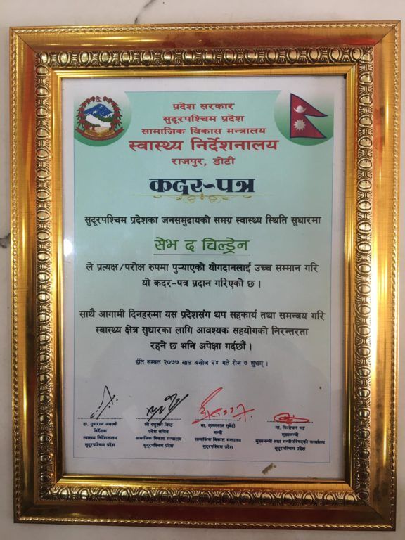 सुदूर पश्चिम प्रदेशको सामाजिक विकास मन्त्रालय अन्र्तगत स्वास्थ्य निर्देशनालयले सेभ द चिल्ड्रेनलाई कदर पत्र प्रदान गर्दे सम्मान गरेको हो ।