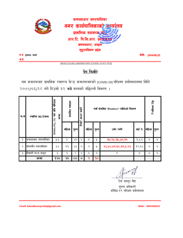 बुधबार १२० जनाको परिक्षण गरिएकोमा १२ जनामा संक्रमण देखिएको कमलबजार पिसिआर प्रयोगशलाका सुचना अधिकारी टेक बहादुर बिष्टले बताए ।