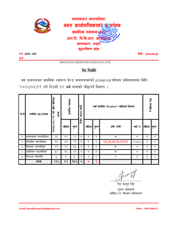 बिहिबार २२४ जनाको परिक्षण गरिएकोमा ६ जनामा संक्रमण देखिएको कमलबजार पिसिआर प्रयोगशलाका सुचना अधिकारी टेक बहादुर बिष्टले बताए ।
