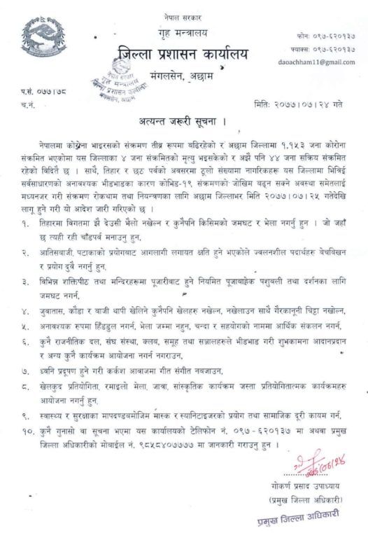 तिहारमा देउसी भैलो नखेल्न जिल्ला प्रशासन कार्यालय अछामको आग्रह
