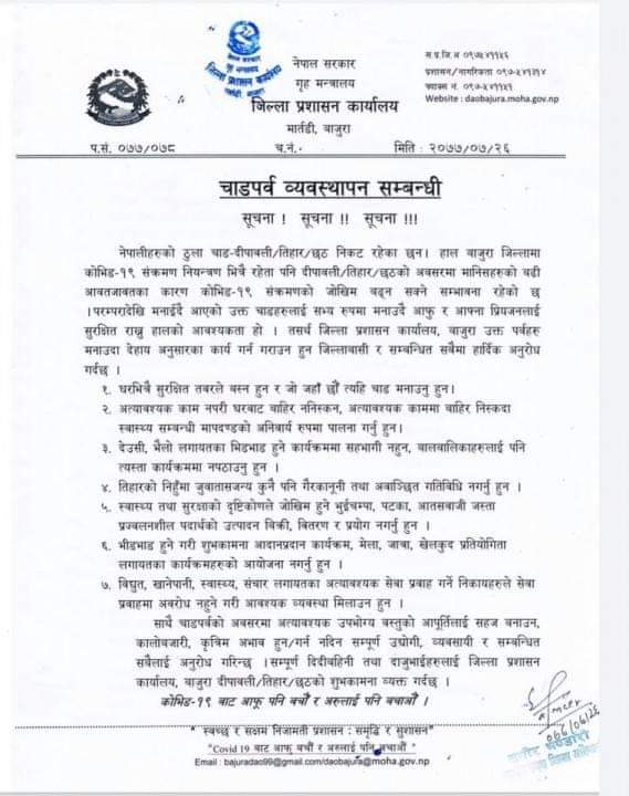 चाडपर्वको समयमा मानिसको आवतजावत बढि हुने भएकाले संक्रमण फैलिने सक्ने भन्दै जिल्ला प्रशासन कार्यलय बाजुराले भिडभाड विना नै चाडपर्व मनाउन आग्रह गरेको छन ।