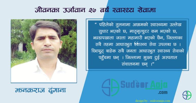 अछाम । सम्रग अछामको जनस्वास्थ्यको परिर्वतन र सुधारका लागि दुई दशक भन्दा बढी सयम देखि अनवरत रुपमा स्वास्थ्य क्षेत्रमा क्रियाशिल व्यक्तीको नाम हो झनकराज ढुंगाना । अछाम जिल्लाको मंगलसेन नगरपालिका वडा नं. ५ मा जन्मेका ढुंगानालाई घर नजिकैको अस्पतालका कारण स्वास्थ्य क्षेत्रमा प्रबेश गर्ने प्रेरणा मिल्यो । उनलाई याद छ, अस्पतालमा अरुले बिरामीको उपचार तथा काम गरेको देख्दा ढुंगानालाई पनि यहि पेशमा जोडिन् पाए हुन्थ्यो भन्ने मनमा लागिरह्यो । नभन्दै एस.एल.सि. पास गरी प्रमाण पत्र तह अध्ययन गर्दै गर्दा अछामबाट कोटामा सि.एम.ए. पढ्ने अवसर उनले पाए । एसलसीको प्राप्तांकका आधारमा जिल्लाबाट १३ जनालाई छनौट गरिएको कोटामा उनि पनि पर्न सफल भए । उनि भन्छन् ‘घर नजिकै अस्पताल भएका कारण मैले स्वास्थ्य क्षेत्र मार्फन नै आफ्नो क्यारियर अगाडी बढाउने दृढता लिएर अघि बँढे ।’