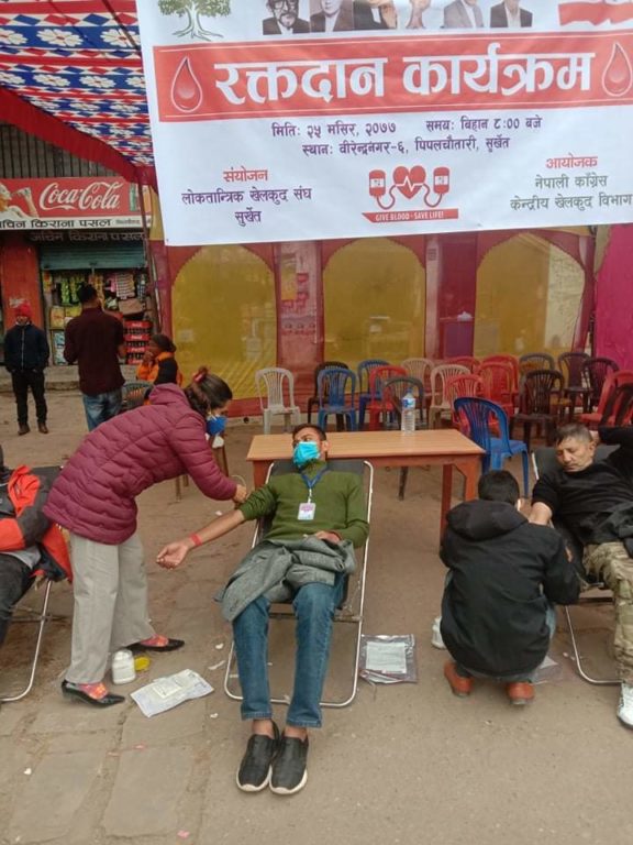 नेपाली काँग्रेस केन्द्रीय खेलकुद विभागकाे अायाेजना र लोकतान्त्रिक खेलकुद संघ सुर्खेले संयाेजन गरेकाे गरेकाे कार्यक्रममा ७० जनाले रगत दान गरेका हुन ।