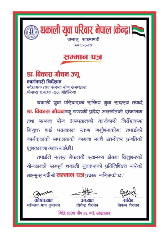 नेपालको पहिलो संक्रामक तथा सरुवा रोग अस्पताल गण्डकी प्रदेशको कार्यकारी निर्देशकमा डा. गौचन नियूक्त भएको भन्दै परिवारले सम्मान गरेको हो ।