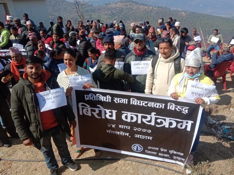अछाम सदरमुकाम मंगलसेनमा प्रदर्शन गरिएको हो । प्रदर्शनमा सहभागीहरुले ‘प्रतिनिधिसभा पुनर्बहाली गर’, ‘बेरोजगार बिमा लागु गर’, ‘सर्वसत्तावाद मूर्दावाद’, ‘सबै श्रमिकहरुको स्थानीय तहमा पञ्जीकरण गर’लगायत नारा लेखिएका प्लेकार्ड बोकेका थिए ।