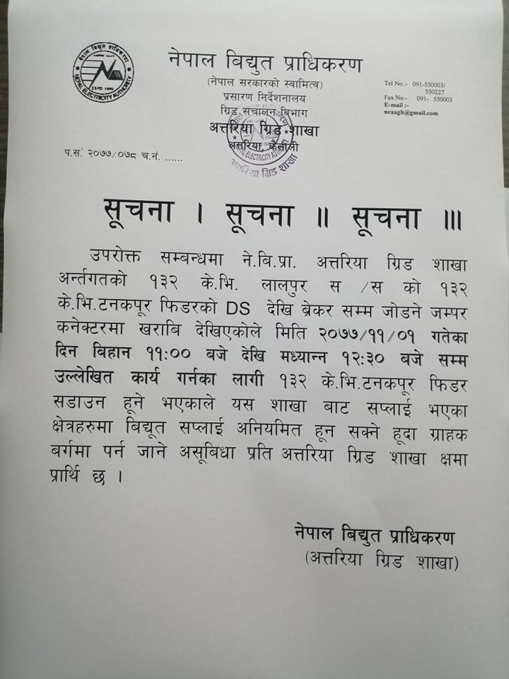 प्राधिकरणले अत्तरिया ग्रिड शाखा अन्तरगतको १३२ केभी लालपुर सबस्टेशनको १३२ केभी टनकपुर फिडरको डिएसदेखि ब्रेकरसम्म जम्पर कनेक्टरमा खराबी देखिएकाले सो समयमा मर्मत कार्य गरिने बताएको छ।