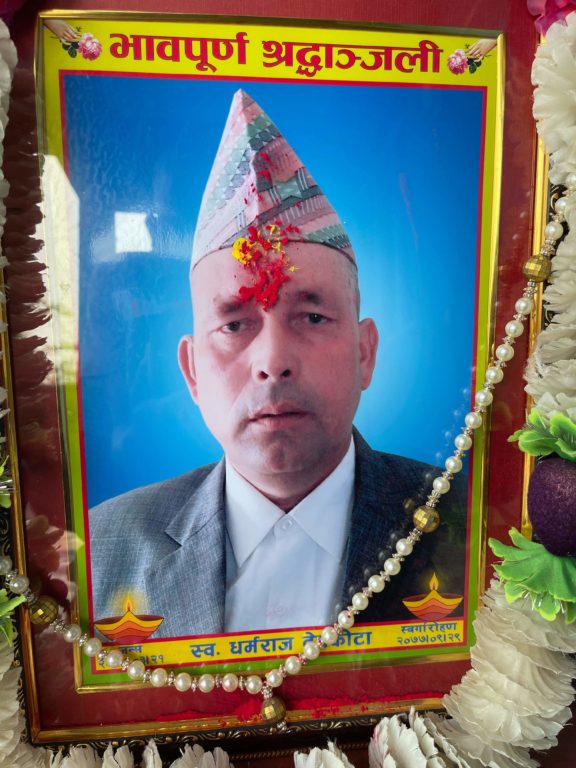 एक बहिनिको ससुरा , अर्को बहिनिको जेठाजु , दाजुको जेठान अनि हाम्रै परिवारमा उहाँ ( साविकको विनायक गाविसका पुर्व अध्यक्ष धर्मराज देवकोटा ) को आफ्नो ससुराली पनि । यति नजिकको नाता सम्बन्ध थियो । उमेर ले म उहाँको छोराहरूको समवयी तर पनि मलाई साथी जस्तो व्यबहार गर्नुहुन्थ्यो । उहाँ ले मलाई वेदजी भन्नुहुन्थ्यो । म उहाँ लाई अध्यक्ष ज्यु भनेर सम्बोधन गर्थे । मैले पनि उहाँ लाई इज्जत र सम्मान दिन कुनै कन्जुस्याइँ गरिन ।नेपाली कांग्रेसको नेता , साविकको विनायक गाविसका पुर्व अध्यक्ष उहाँ हाम्रो नातेदार मद्यको बलियो खम्बा हुनुहुन्थ्यो । उहाँ संग आस थियो ,उत्तिकै भरोसा पनि । उहाँको अवसानले गहिरो चोट पुगेको छ । उहाँको अबसान पछि मन मुटु छियाछिया भएको छ । हाम्रो पार्टी नेपाली कांग्रेसले एक असल अनि कुशल नेता गुमायो । मैले भरोसा गरेको अभिभावक सरहको ब्याक्तित्व गुमाए । आदरणीय ब्याक्तित्वको महाप्रस्थान भएको पनि ४५ दिन पुगेको छ । मैले निकै सम्मान गर्ने ब्याक्तित्व लाई ४५ औं दिनको पुण्यतिथीमा हार्दिक श्रद्धाञ्जली लेख्दा मन गह्रौ भएको छ । अध्यक्ष ( विनायक गविसका पुर्व अध्यक्ष धर्मराज देवकोटा ) ज्यु हजुरको बैकुण्ठ बास होस । दिदी नन्दकला देवकोटा , भान्जाहरु डा.हरिहर देवकोटा , डा. पुष्प देवकोटा, डा.जनक देवकोटा , भान्जीहरु डा. अर्चना , सरिता , बहिनी ज्वाइँ शंकर लगायत शोकाकुल परिवारजनमा गहिरो समवेदना प्रकट गर्दछु ।