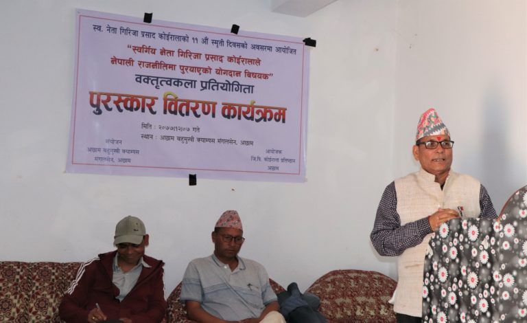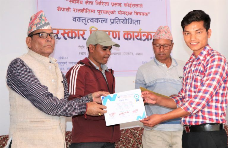 प्रतिष्ठान अछामको आयोजना तथा अछाम बहुमुखी क्याम्पसको संयोजनमा भएको नेपाली राजनितिमा स्व. जिपी कोईरालाको योग्दान बिषयक वक्तिृत्वकला प्रतियोगिताका विजेता र सहभागीलाई पुरुस्कार र प्रमाण पत्र वितरण गरिएको थियो ।