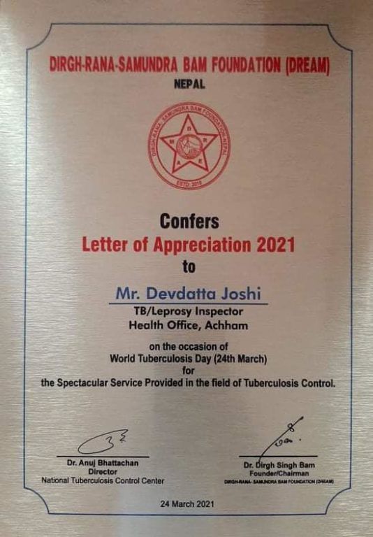 स्वास्थ्य कार्यालय अछाममा रहेर क्षयकुष्ठ रोग निवारणमा खेलेको भुमिकाको कदर गर्दै सम्मानि गरिएको हो । उनलाई दिर्घराना बम, समुन्द्रा प्रतिष्ठानले बिश्व क्षयरोग दिवसको अवसरमा सम्मान गरेको हो ।