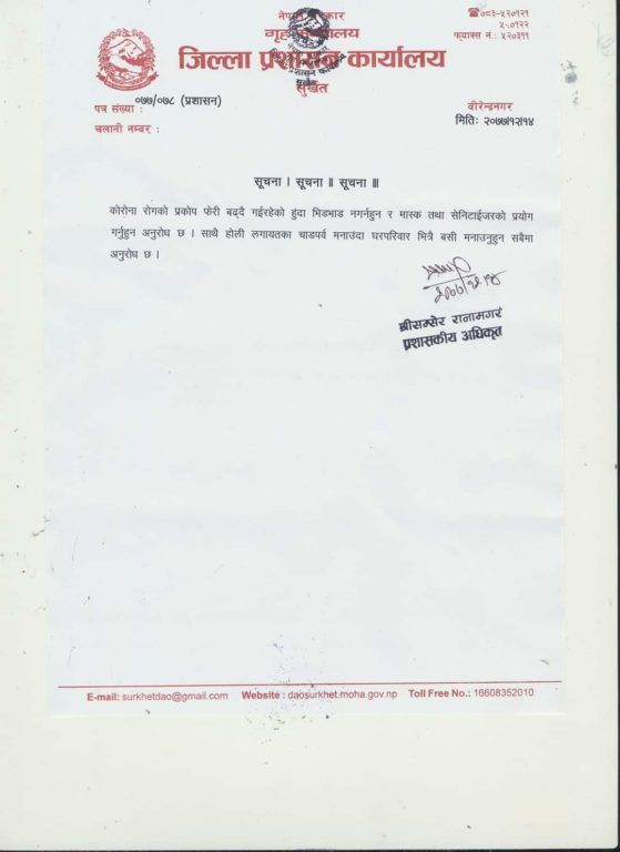नम बहादुर खड्का, सुर्खेत : जिल्ला प्रशासन कार्यालय सुर्खेतले होली नखेल्न आग्रह गरेको छ ।