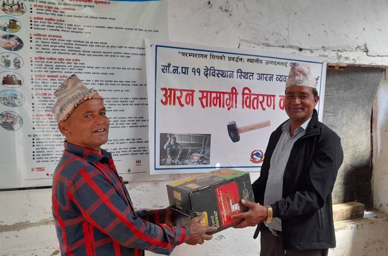 वडा अध्यक्ष गणेश बहादुर खड्काको अध्यक्षतामा भएको कार्यक्रममा वडामा रहेका आठ जना आरन ब्यावसायीहरुलाई परमपरा गत सिपको प्रवर्द्धन स्थानीय उत्पादनलाई प्रोत्साहनका लागि आरन मेशिन हतौडा काठ रेत फलामे रेत लोहा पिटने पडो, घन सडासो वितरण गरेको हो ।