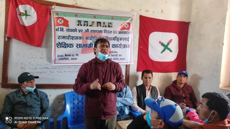 अछाम : नेपाल विद्यार्थी संघको ५२ औँ स्थापना दिवसको अवसरमा नेविसंघ अछामले जिल्लाको रामारोशन गाउँ पालिकाका बाढी पहिरो पिडित र विपन्न विद्यार्थीलाई शैक्षिक सामाग्री वितरण गरेर मनाएको छ ।