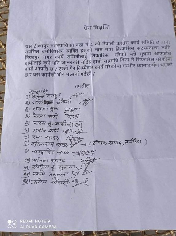 अछाम । आफुहरुलाई थाह नै नदिएर क्रियाशिल सदस्यता पठाएको भन्दै टिकापुर नगरपालिका वडा नं. ८ का १३ जनाले आपत्ती जनाएका छन् ।