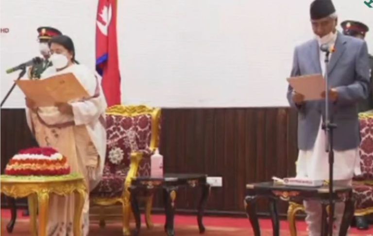 मंगलबार बेलुका ८ बजेर २५ मिनेटमा भण्डारीले प्रधानमन्त्री देउवालाई शपथ खुवाएकी हुन्।