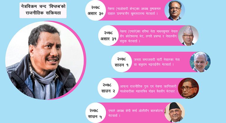 विप्लव पछिल्लो एक सातायता भने एकाएक राजनीतिक भेटघाटमा सक्रिय भएका छन्। असार २९ गते केपी शर्मा ओली नेतृत्वको सरकार विस्थापन गर्दै कांग्रेस सभापति शेरबहादुर देउवा प्रधानमन्त्रीमा नियुक्त भएसँगै विप्लवले राजनीतिक भेटघाट तीव्र पारेका हुन्।