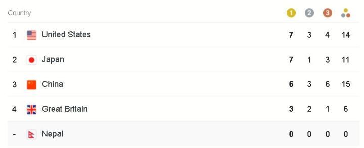 अमेरिका र जापानले सात/सात स्वर्ण पदक जितेका छन् । अमेरिकाले सात स्वर्ण, तीन रजत र चार कास्यसहित १४ पदक जितेको छ । त्यस्तै जापानले सात स्वर्ण, एक रजत र तीन कास्य पदकसहित ११ पदक जितेको छ ।