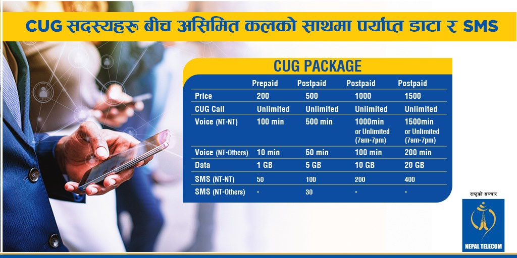 साथै सस्तो दरमा डेटा चलाउन र एसएमएस पठाउन पनि सकिन्छ । यतिमात्र होइन, सीयूजीमा आबद्ध नभएका नेपाल टेलिकमका अन्य नम्बरमा समेत सुलभ दरमा कुराकानी गर्न सकिन्छ ।