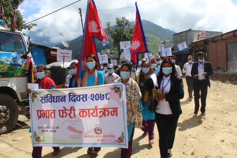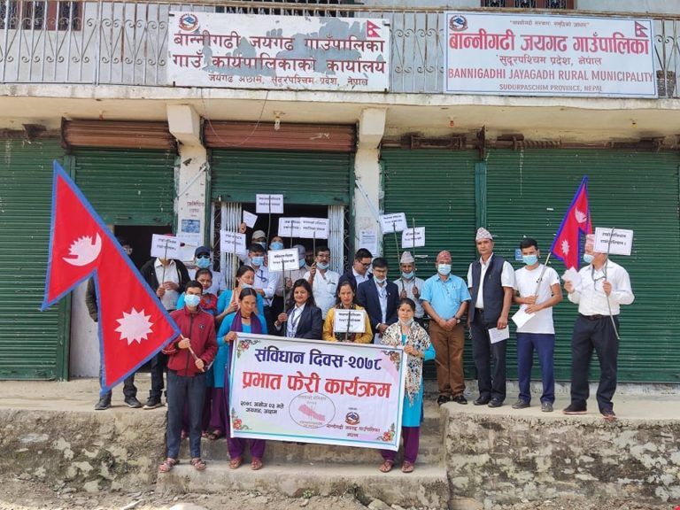 अछाम : संविधान दिवसको अवसरमा अछाम जिल्लाको बान्नीगढी जयगढ गाउँपालिकामा प्रभात फेरी कार्यक्रम गरिएको छ। गाउँपालिकाको आयोजनामा प्रभात फेरी आयोजना गरिएको पालिका अध्यक्ष राजेन्द्र खड्काले बताए।