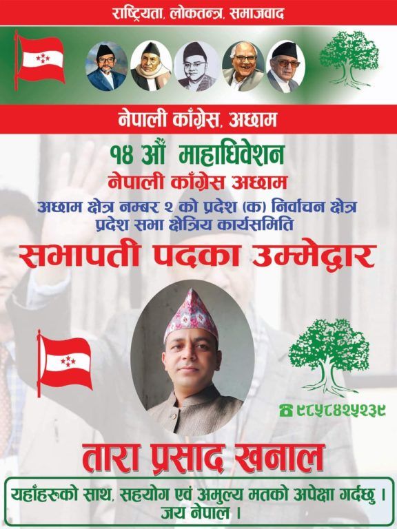 अछाम । नेपाली कांग्रेस क्षेत्र नं. २ को प्रदेश सभा क का लागि युवा नेता तारा प्रसाद खनालले उम्मेद्धारी घोषणा गरेका छन् । यहि १२ गते हुने प्रदेश सभाको निर्वाचनमा प्रदेश सभा सभापती पदका लागि उम्मेद्धारी घोषणा गरेको बताए ।