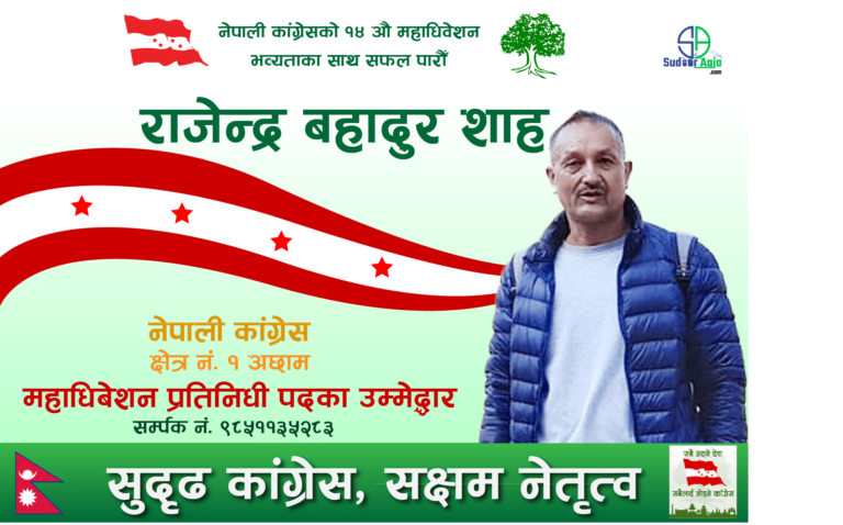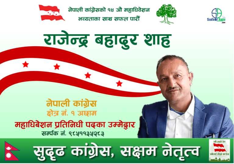 अछाम । नेपाली कांग्रेस अछामका नेता परोपकारी व्यक्ती राजेन्द्र बहादुर शाहले महाधिबेशन प्रतिनिधीमा उम्मेद्धारी घोषणा गरेका छन् । उनले १४ औँ महाधिबेशनमा अछाम क्षेत्र नं. १ का महाधिबेशन प्रतिनिधीमा आफ्नो उम्मेद्धारी घोषणा गरेका हुन् ।