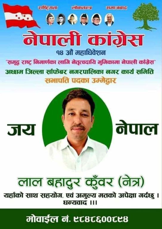 अछाम : नेपाली कांग्रेस साफेबगर नगरपालिका कार्यसमितिको सभापतिमा लाल बहादुर कुँवर बिजयी भएका छन् ।
