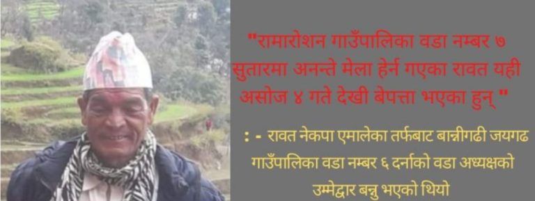 रावत स्थानीय तहको निर्वाचनमा बान्नीगढी जयगढ गाउँपालिका वडा नम्बर ६ दर्नाको वडा अध्यक्षको उम्मेद्वार बन्नु भएको थियो । घटनाबारे प्रहरीले अनुसन्धान गरिरहेको छ । – बान्नीगढीटूडे