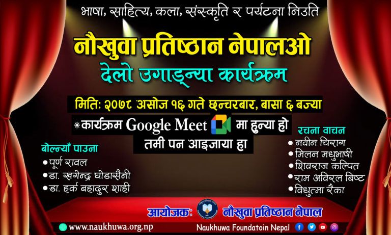 कार्यक्रमको सुरुवातमै प्रतिष्ठान र कार्यक्रमको उदेश्य माथि जानकारी दिदैँ अध्यक्ष संघर्षले भाषाको अस्तित्व जोगाउन, संस्कृतिको खोजतलास गर्न, साहित्य र साहित्य सिर्जनाकारहरूको पहिचान गर्न, पर्यटकिय सम्भावनाहरूलाई उजागर गर्न संस्थाले विभिन्न कामहरू गर्ने बताए । नौखुवा प्रतिष्ठान नेपाल ठुलो उद्देश्यका साथ अघि बढ्ने भन्दै अध्यक्ष संघर्षले आफ्ना भाषा, संस्कृति आफ्ना सम्पत्ति भएकोले पछिल्ला पुस्तासम्म पुस्तान्तरणका लागि काम गर्ने बताए ।